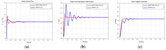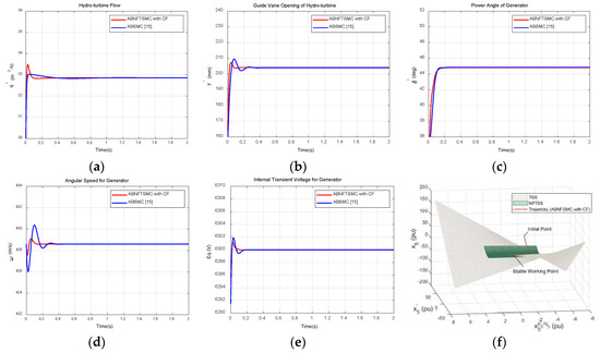 Figure 7a–e. We can observe that for these control strategies, all system state variables track the desired reference signals in a timely manner. However, the ABSMC scheme exhibited a larger chatter effect and a poor convergence time due to its operating condition, i.e., the controller limit and nonsingularity problem.