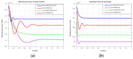 15] reaches only 95.38%. In addition, the total mechanical power (MP) of the hydro-turbine for the proposed control scheme with a flow water stochastic intensity of 0.01 and 0.6 is increased by 363 and 376 kW compared with the ABSMC [