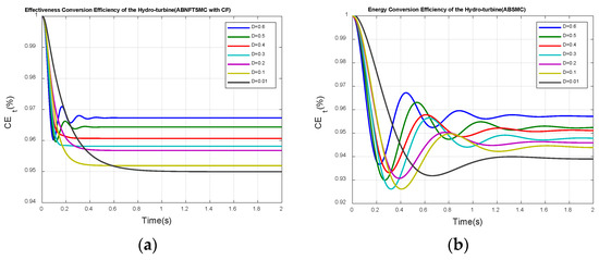 The conversion efficiency of the hydro-turbine and generator for our proposed control method and the ABSMC method [