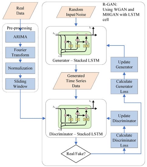 Figure 3 depicts the overview of the R-GAN approach. As R-GANs use RNNs for the generator and discriminator, data first needs to be pre-processed to accommodate the RNN architecture. Accordingly, this section first describes data pre-processing consisting of feature engineering (ARIMA and Fourier transform), normalization, and sample generation (sliding window). Next, R-GAN is described and the evaluation process is introduced.