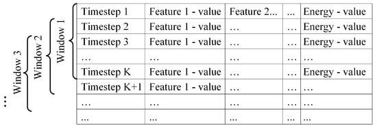 Figure 4 with each row containing readings for a single time step. Note that features in this matrix include all features contained in the original data set (core features) such as appliance status or the day of the week, as well as additional features engineered with ARIMA and FT.