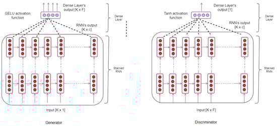 45]. The stacked RNN is followed by the dense layer in both the generator and discriminator. The dense layer activation function for the generator is GELU because of the same reasons explained with GELU selection in a stacked RNN. In the discriminator, the dense layer activation function is tanh to achieve real/synthetic classifications.