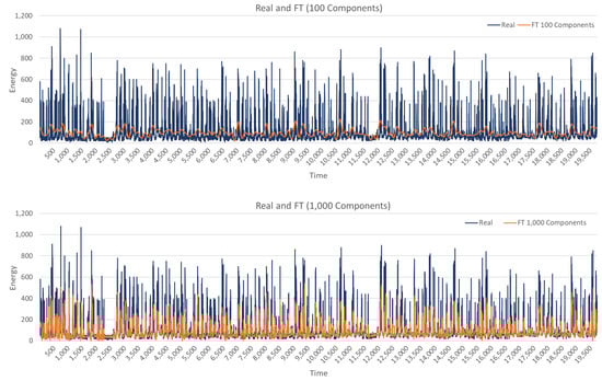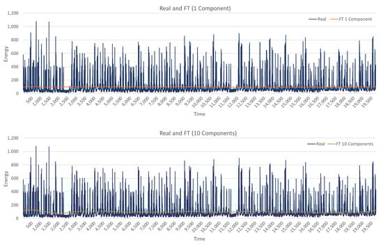 Like with ARIMA, only the energy feature is used with FT. The energy time series is decomposed into sinusoidal representations, n dominant frequencies are selected, and a new time series is constructed using these n constituent signals. This new time series represents a new feature. When the number of components n is low, the new time series only captures the most dominant cycles, whereas for a large number of components, the created time series approaches the original time series. One value of n creates one new feature, but several values with their corresponding features are used in order to capture different temporal scales.