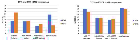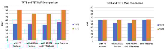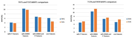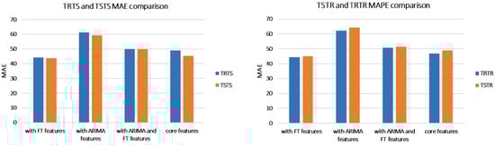 Similar to the UCI data set, TSTR accuracy is close to TRTR accuracy in terms of both, MAPE and MAE, for all models, irrelevant of the number of features. As in the UCI experiments, this indicates that the accuracy of the forecasting model trained with synthetic data is close to the accuracy of the model trained with real data. The best model was with core and FT features: it achieved the MAPE of 4.86% when trained with real data (TRTR) and 5.49% when trained with synthetic data (TSTR).