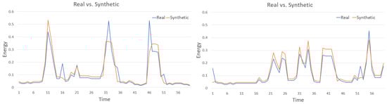 Figure 12 shows examples of two generated samples compared with the most similar real data samples. It can be observed that the generated patterns are similar, but not the same as the real samples; thus, data looks realistic without being a mere repetition of the training patterns. Although