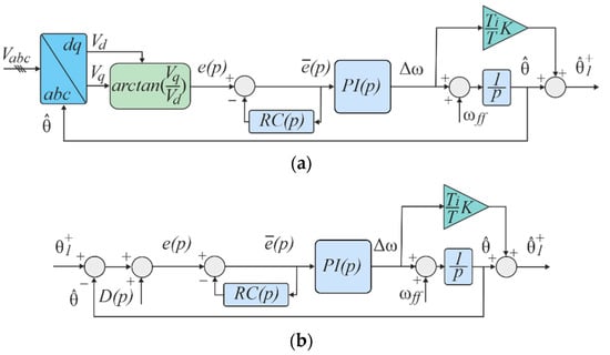 Equation (20) shows the inability of the initially proposed structure to follow the fundamental grid voltage phase angle without a steady-state error in situations when the frequency varies from the nominal. In order to solve this problem, additional compensation consisting of a gain KTi/T from the output of PI(p) to the estimated FGVVPA is proposed. In Figure 5a, a complete block diagram of the proposed PLL is presented, hereafter called the repetitive control enhanced synchronous reference frame phase-locked loop (RCE-PLL). Figure 5b presents the small-signal model of the RCE-PLL as the small-signal model from Figure 5c, only in a different form. The presents an estimated angle of the positive fundamental grid voltage vector, and it differs from the reference frame vector angle when the frequency differs from the nominal.