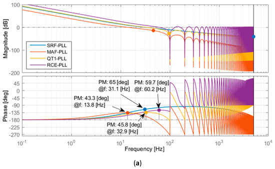 Using Figure 8, the combination of natural frequency and parameter is selected. This selection enables the RCE-PLL for both a phase and frequency settling time inside the 2% band for no more than 20 ms, according to the Linear Analysis Tool. Finally, open- and closed-loop Bode plots of RCE-PLL along with other PLLs (designed according to Table 2) used for comparison are presented in Figure 9a,b, respectively. RCE-PLL has the largest crossover frequency, and its phase margin is second only to SRF-PLL. Figure 9b shows an envelope of RCE-PLL closed-loop gain at about −5 dB with a slope of 0 dB/dec after the first designed disturbance rejection frequency. Compared to −20 dB/dec of QT1- and −40 dB/dec of MAF-PLL, it is to be expected that the eventual occurrence of disturbances that are not considered for rejection when the RCE-PLL is designed, might not have sufficient attenuation. Finally, degradation of the RCE-PLL FGVVPA estimation performance can be expected in the presence of evenly distributed noise, high-frequency noise, or interharmonics. The occurrence of interharmonics is possible in a weak grid that contains a substantial share of photovoltaic inverters with the maximum power point tracking algorithm operating with low output power, arc furnaces, asynchronous conversion systems, or wind turbines with substantial mechanical oscillations [20]. One can speculate based on the provided information that the application of RCE-PLL is limited to the control of converters with decent quality voltage sensors, connected to a strong grid with low-frequency drift, and copes with disturbances related to voltage imbalance or harmonics.