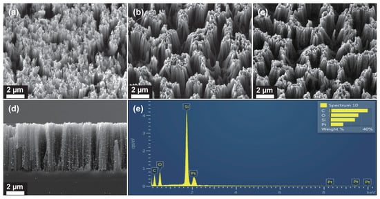 Figure 1 shows SEM images of the SiNW, SiNW/C, and SiNW/C@Pt samples and the elemental composition of the final SiNW/C@Pt material. SiNW arrays were formed on Si substrates using MaCE and had diameters ranging from 60 to 180 nm and lengths up to 5.4 m. In Figure 1a–c, one can see that the SiNW arrays are packed densely and bundled together because of mutual attraction [27,28]. The surface of the pristine SiNW with no carbon shell is sharp and coarse but becomes smooth after the carbon shell is deposited. Figure 1c,d shows the presence of Pt NPs decorated on the carbon shell. The elemental analysis in Figure 1e was obtained from the SiNW/C@Pt. The Si, C, Pt, and O in this plot come from the SiNW, carbon shell, Pt NPs, and oxides that form between the SiNW and the carbon shell.