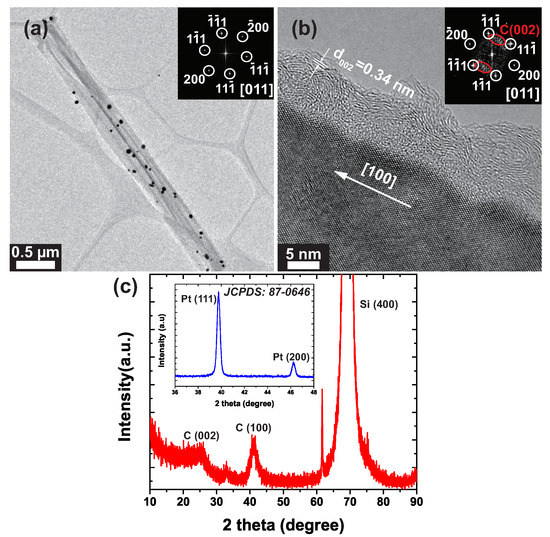 Figure 2a,b presents a low-resolution TEM image of a single SiNW/C@Pt and a high-resolution TEM image of the SiNW/C with no Pt NPs, respectively. As shown in Figure 2b, the distance between Si (200) fringes, measured perpendicular to the wire axis in the [100] direction, is about 0.27 nm, which is almost identical to the same measurement of face-centered cubic (fcc) Si (JCPDS No. 80-0018). The fast Fourier-transformed electron diffraction (FFT-ED) pattern recorded from the [011] direction confirms that the SiNWs were formed from single-crystalline Si in the [100] direction. The carbon shells grown on the SiNW surface along the wire axis had an inter-distance of about 0.34 nm, and XRD patterns confirmed that the (002) plane peaked at 25.97 (see Figure 2c and the FFT-ED pattern in the inset of Figure 2b). We confirmed that the Pt NPs decorated on the material’s surface were successfully immobilized on the carbon shell using the images in Figure 1b and Figure 2a. The inset of Figure 2c shows an XRD pattern from the Pt NPs decorated on the carbon shell. The Pt NPs show two peaks at about 2 = 39.7 and 46.2, which correspond to the (111) plane with the inter-planar spacing of 0.22 nm and the (200) plane with the inter-planar spacing of 0.20 nm, respectively. Therefore, the Pt NPs resemble face centered cubic (fcc) Pt (JCPDS No. 87-0646).