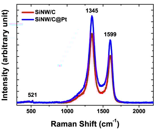 Figure 3 presents Raman spectra of the SiNW/C and SiNW/C@Pt samples. Three peaks are apparent. The peak at 521 cm is caused by the scattering of the first-order transverse optical (TO) phonon in the Si substrate. The most distinct peaks in the Raman spectra are the G band appearing at 1599 cm and the D band at 1345 cm. The G band originates from the in-plane vibration of sp-hybridized carbon atoms and has a doubly degenerate phonon mode with E symmetry at the center of the Brillouin zone [29], thus indicating the presence of graphitic carbon in the carbon shell. The D band is induced by the presence of defects and has the breathing mode of A symmetry [30]. Though the ratios of both SiNW/C and SiNW/C@Pt were nearly 1.40, the Raman intensity increased after the Pt NPs were decorated on the SiNW/C, indicating that the Pt NPs encourage surface reactions. Therefore, we expect that SiNW/C@Pt will serve as a very efficient electrocatalyst.