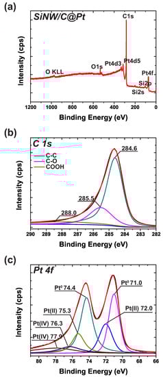 We investigated the functional groups and chemical states present in the SiNW/C@Pt using XPS analysis, and the results are shown in Figure 4. The survey scan in Figure 4a shows peaks from Si 2p, Si 2s, C 1s, and Pt 4f; these indicate the presence of the carbon shell on the SiNW surface and the Pt NPs on the carbon shell. High-resolution XPS spectra corresponding to C 1s and Pt 4f from SiNW/C@Pt are shown in Figure 4b,c, respectively. In Figure 4b, the peak at 284.6 eV is usually attributed to the C–C bond (basal-plane sp hybridization), and the peaks at 285.5 eV and 288.0 eV are typically assigned to the C–O and COOH functional groups (defect sp hybridization), respectively. Finally, Figure 4c shows the XPS spectra of Pt 4f doublets (4f and 4f) for the Pt NPs on top of the SiNW/C matrix. The principal doublets at 71.0 eV (Pt 4f) and 74.4 eV (Pt 4f) are characteristic of metallic Pt (Pt). The peaks at 72.0 eV (Pt 4f) and 75.3 eV (Pt 4f) correspond to Pt, and the peaks located at 76.3 eV and 77.9 eV correspond to Pt. The principal Pt 4f and 4f peaks were slightly shifted to binding energies lower than the commonly accepted binding energies of Pt 4f and 4f, perhaps due to electron transfer from the SiNW/C to the Pt NPs [31].