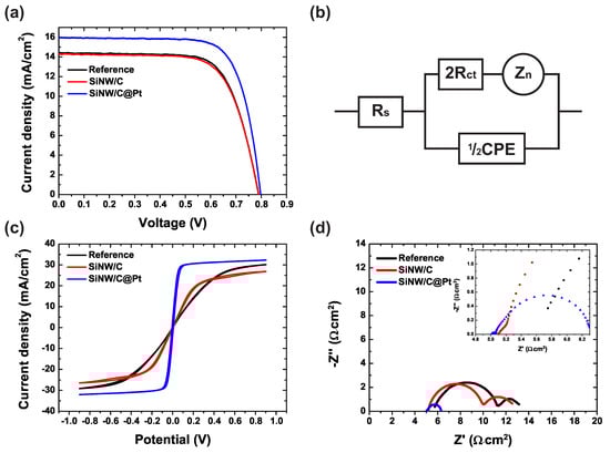 (a) Current–voltage (J–V) characteristics of the dye-sensitized solar cells (DSSCs) fabricated with reference (fluorine-doped tin oxide (FTO)/Pt), SiNW/C, and SiNW/C@Pt counter electrodes measured under 1 sun illumination (AM 1.5 G, 100 mW/cm); (b) equivalent circuit model of the symmetrical dummy cells consisting of the identical counter electrodes (CEs); (c) cyclic voltammograms; and (d) Nyquist plots of the symmetrical dummy cells.
