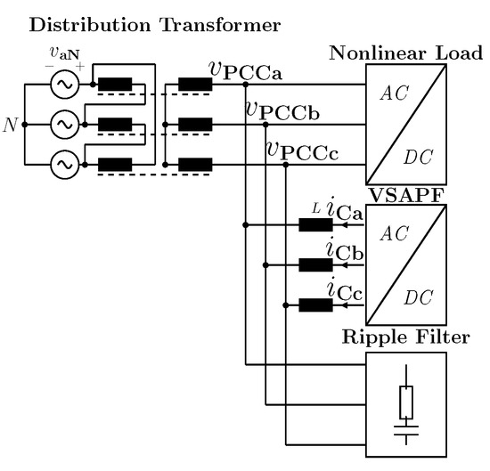 where the phase shift between the voltage at harmonic frequency h with respect to the phase reference is . The VSAPF control law, defined by Akagi in [30], states that to emulate a resistance at harmonic frequencies, the harmonic compensating currents iCh need to be in phase to the existent harmonic voltages at the PCC, it follows that