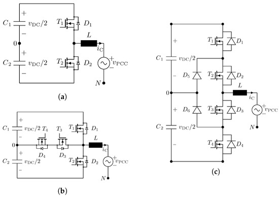 Schematics of conventional converter topologies. Just one leg of the three phase converter is shown in all cases. (a) Two-level (2L) topology. (b) Three-level neutral-point piloted (3L-TNPC) or 3L T-Type topology. (c) Three-level neutral-point-clamped (3L-NPC) [1].