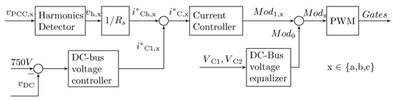 The VSAPF control system is depicted in Figure 3. It has four main parts: two outer loops, one inner current control loop, and one DC-side voltage equalizer. The first outer loop is the one in charge to generate the reference for the harmonic content of the compensating currents. First, the first outer loop senses the grid voltages vPCC and then extracts the harmonic content vh of each phase through signal processing over the vPCC signals. The mentioned process removes the fundamental component v1 from vPCC. Afterwards, vh is scaled by the reciprocal of the target virtual resistance Rs to generate the reference i*Ch. As the VSAPF is meant to operate with a self-supporting DC-Bus, a second outer loop is designed to maintain the voltage of the DC-Bus to a constant level. Depending on whether the DC-bus voltage is below or above its reference, the second outer loop sets the reference for the fundamental current iC1 to absorb/release fundamental active power from/to the power system [29]. The third component of the system is the inner current control loop. The former determines the appropriate modulation reference to be fed into the pulse width modulator (PWM) such that the VSC synthesizes the compensating currents matching the reference i*C = i*C1 + i*Ch. In this work, the current controller design is based largely on [32]. Finally, as all the 3L converters in this study are realized with a DC-side voltage divider (two capacitors in series in the DC-bus), the capacitors on the DC-bus are subject to suffer of the partial DC-side voltage drift phenomenon where the voltage of both of the capacitors becomes unbalanced [33,34]. Therefore, a DC-side voltage equalizer becomes necessary to maintain the voltage of both of the DC-Bus capacitors symmetrical.