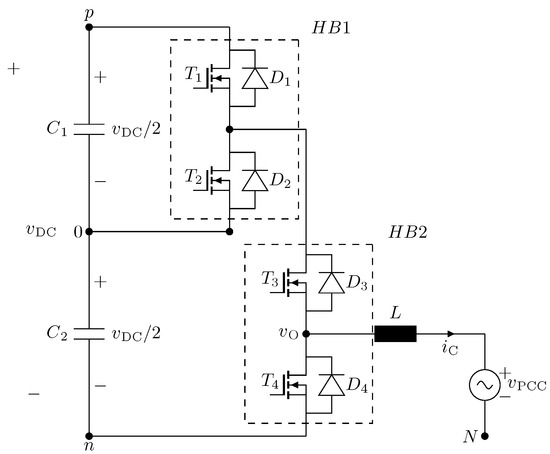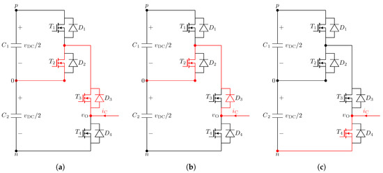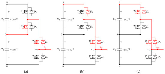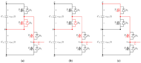 For the given topology, it is important to ensure that any desired output voltage (vDC/2, 0, –vDC/2) can be generated for positive and negative currents. In other words, irrespective of the direction of the current, it should be possible to select any of the three levels at the output port. For example, for IC > 0, to connect the AC output port (vo) of the converter to vDC/2, the semiconductors T1 and T3 conduct the current (see Figure 6). To achieve 0 in the AC output port for IC > 0, the semiconductors T2, D2, and T3 conduct the current. In contrast to connect the ac output port to –vDC/2 for IC > 0 the semiconductors T4 and D4 carry the current. The proposed non-conventional topology is named in this paper as asymmetrical three-level converter topology (3L-ASYM). The reason behind this name is the asymmetry on the number of semiconductors carrying the current at different output voltage levels. The details of the current passing to each of the semiconductors in the different converter states will be discussed in the following subsections.