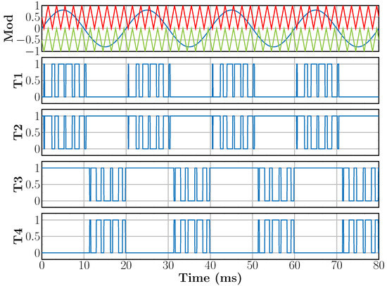 PWM generation waveforms. From top to bottom: reference voltage: modulation signal (blue), Triangular Carrier Signal 1 Vtri1 (red), and Triangular Carrier Signal 2 Vtri2 (green). Gating signal for switch T1. Gating signal for switch T2. Gating signal for switch T3. Gating signal for switch T4 (Based on [1]).