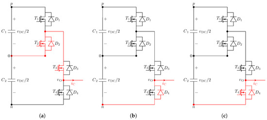 Current commutation, transition from switching state 0 to p for IC > 0. Current flow depicted in red. (a) Switching state 0. (b) Blanking time (between T1 and T2) interval. (c) Switching state p.