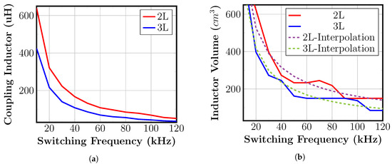 Notice that the coupling inductors do not perceive a difference between the 3L-TNPC, 3L-ASYM or 3L-NPC power circuit that is connected to them. At the end, the coupling inductors just see a three level generated waveform. Thus, for the inductor losses discussion, we will speak in general about the all three level topologies. Moreover, as is explained at Section 4, the inductor value decreases as the switching frequency increases in order to maintain the same current ripple. On the other hand, according to Figure 10a, the value of the coupling inductor for a 3L power converter will be always smaller than in the 2L converter. A smaller inductor means a smaller inductor volume as can be seen in Figure 10b.