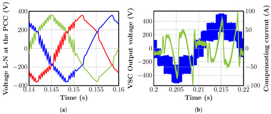 (a) VPCC behavior in presence of the 3L-NPC-based VSAPF. (b) 3L-NPC-based VSAPF compensating current IC for the phase A (green) and converter output voltage vo-N for the same phase.