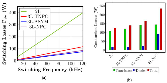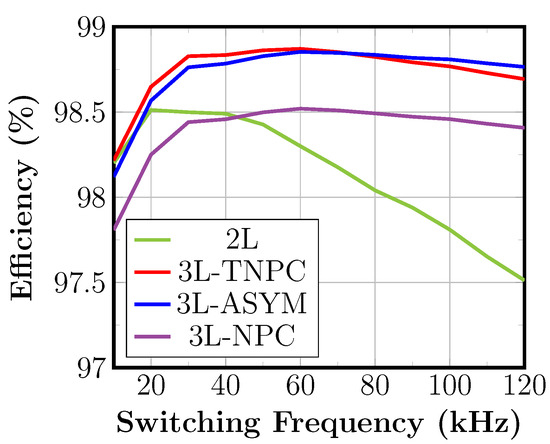 Figure 19a shows the total switching losses for the different topologies. It can be seen that the 2L topology shows the higher losses due to the fact that the switches commute always at the full DC-Bus voltage (750 V). The 3L topologies show better switching losses performance given that they conmutate only at half of the DC-Bus voltage (375 V). The 3L-NPC and 3L-ASYM outperform the 3L-TNPC power circuit. The reason is that switches rated for 1200 V exhibit higher switching energy loss than switches rated at 900 V (see Table 3). As the 3L-TNPC has more switches rated at 1200 V than the 3L-ASYM and 3L-NPC, the 3L-TNPC will produce the most switching losses among all the three level topologies. The switching losses performance of the 3L-ASYM and 3L-NPC is similar and practically overlap in the figure. The performance of the 3L-TNPC from the switching losses perspective degrades as the switching frequency increases and become less and less attractive at high switching frequencies.