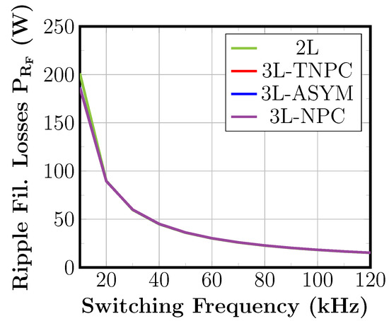 where RF is reciprocal to the switching frequency. Therefore, the ripple filter losses in the form decrease in the same proportion for all topologies as the switching frequency is increased as can be seen in Figure 16 where the curves (PRF) practically overlap.