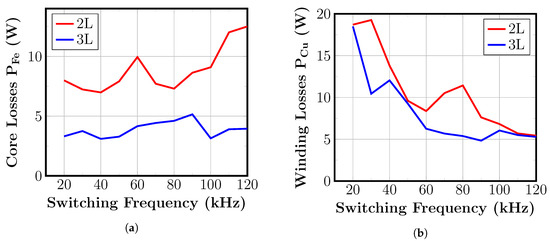 where Bmax is the peak value of the flux density with sinusoidal excitation at frequency f, Kc, and are constants that depend on the core material [46]. Figure 10b implies that the coupling inductors for 3L converters will exhibit always lower core losses than the inductors for the 2L-based converter. This is due to the fact that the volume of the inductors for a 3L converter is going to be always smaller than the volume of the inductors for a 2L converter. Such a fact is confirmed by Figure 17a, which shows an overview of the core losses vs. switching frequency obtained from the simulation on GeckoMagnetics for a single inductor. It is also possible to see in Figure 17a the extreme nonlinear core loss dependency on the switching frequency due to the complex physical core loss mechanics as hysteresis losses and eddy-current losses that are taken in account by the simulation software. On the other hand, winding losses (PCu) are proportional to the number of turns N. In general, the number of turns decrease as the target inductance value decreases. Thus, PCu losses under the constraints of our design decreases as switching frequency increases. This fact can be confirmed by inspection of Figure 17b. The figure shows the winding losses for a single inductor calculated by GeckoMagnetics at different switching frequencies for the 2L and 3L topologies.