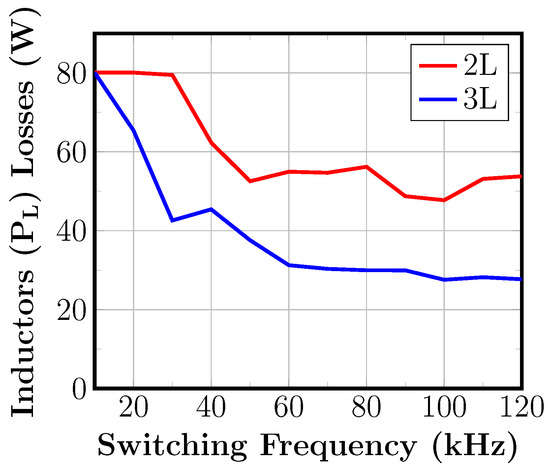 can be seen in Figure 18. It is possible to see that 3L topologies offer significant advantages in comparison with 2L converters from the coupling inductors losses perspective. Also note that moving from 20 kHz to 60 kHz, there is an important reduction on inductors losses. However, beyond 60 kHz the inductors losses decrease just slightly with an increase on switching frequency. There is not too much to gain either in inductor volume or in inductor losses by switching faster than 60 kHz–70 kHz as can seen in Figure 10b and Figure 18.