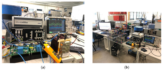 The original design and simulation was conducted for a industrial VSAPF that could be used to compensate the harmonic voltage distortion produced by a 265 kW nonlinear in a power system with a 1 MVA distribution transformer. However, it is difficult to replicate this infrastructure in laboratory conditions (a nonlinear load of 265 kW, cables with high cross section, a 1 MVA transformer, etc.), and therefore the experimental set-up is scaled down in one order of magnitude from 23 kVA to 2 kVA. SiC MOSFETs, SiC Schottky diodes and inductors are chosen based on the components available in the laboratory. The idea of the experimental setup is to demonstrate the feasibility of the solution in an scaled down prototype with reduced currents and reduced voltages. A single leg of the 3L-ASYM converter was build using two Wolfspeed evaluation boards 8020-CRD-8FF1217P-1 (see Figure 20). Each board consists on two SiC MOSFETs C2M0080120D and two SBD diodes C4D20120D all of them in a TO-247 package. Furthermore, each 8020-CRD-8FF1217P-1 was configured as a half-bridge and later both evaluation boards were cascaded. Each SiC MOSFETs’ half bridge is driven by a 2.5 A Avago gate driver (ACPL-W346) that is interfaced through optocopuplers with the control system. A coupling inductor of 100 H is connected to the output port of the single leg in one extreme and the other extreme is connected to the middle point of the DC-Bus as can be seen in Figure 20. The coupling inductor of 100 H is build with two UU93/60 cores of amorphous material (AMCC800A), the windings are build with square copper cable of (10 mm × 7.11 mm) resulting in a total winding section of 71 mm2 with a total resistance at twenty degrees celsius of 1.6 m. A picture of the experimental setup can be seen in Figure 21.