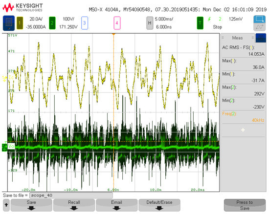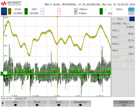 The RMS value of the compensating current is around 14 A and it peaks at 34 A as can be seen in Figure 22. It follows that the power rating of the experimental set-up is