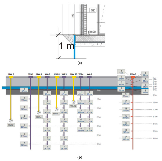 Figure 3. (a) Vertical cross section through an insulated slab. (b) Locations of vertical temperature measuring points vs the EAHX 1 pipes as well as positions of the measurement points on the reference soil temperature line.