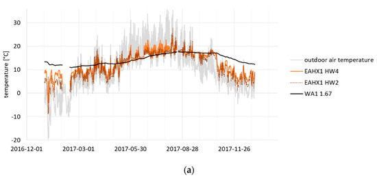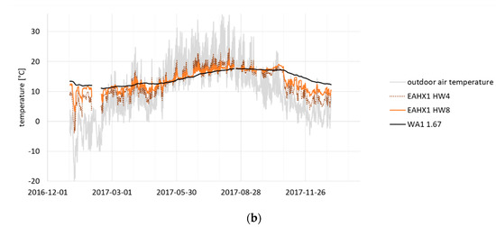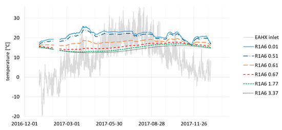 Finally, one may observe that placing the EAHX under the layer of thermal resistance of Rsi, about 5 [m2k]/W or U-value 0.2 K/[m2K], was comparable with the effect of the deeper placement of the EAHX. This is shown in Figure 10 on temperature profiles measured on the D axis (open soil) with depths of 2.67 and 3.67 m.