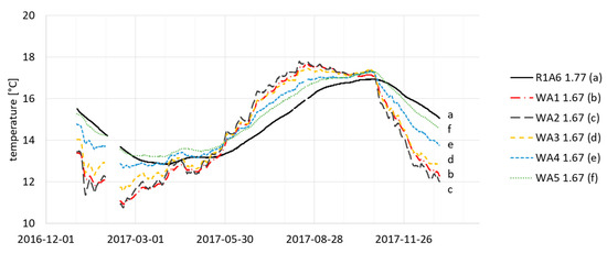 Figure 6. Measurements on the axis WA (as shown under the house in Figure 2) show the variation on the first three measurement profiles coming closer to the reference temperature at some distance. The recording of the measurements lasted one year but was interrupted for a few days for technical reasons.