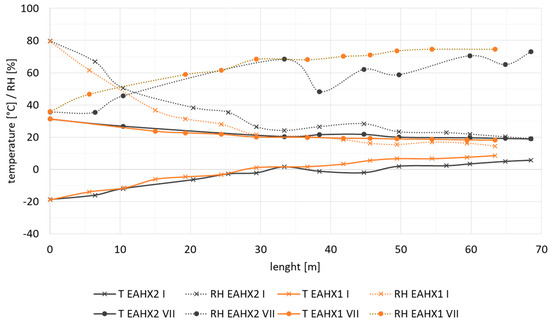 In the summer, there appeared to be no difference in temperature measured by both heat exchangers, which dropped from the initial 30 °C to 20 °C over the first 30 m of the path. Finally, even though one may observe slow changes of temperature over the whole 60 m of the EAHX length, the change over the first 30 m was much higher than on the second 30 m. For both summer and winter, there was about 75%–80% change in the first 30 m distance. Thus, we may conclude that in the studied case the length of 30 m was sufficient for the design purposes.