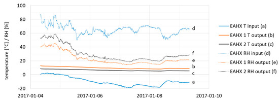 One may observe that with the outdoor temperature falling from near zero to −19 °C, there was a slight decrease of the temperature in the EAHX pipes. The absolute humidity appears to be constant and relative humidity follows the temperature changes in the EAHX pipes. The temperature of the EAHX 1 under the building was somewhat higher in the winter.
