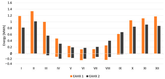 Figure 9 shows the calculated capabilities of both EAHX 1 and 2 showing that EAHX 1 located under the building produced more heating energy in winter and cooling in summer than EAHX2 which was located in the ground adjacent to the building. We have called it heating index because from March through September we may observe that both the heating and cooling capability should be used and as previously discussed by Romanska–Zapala [1], one needs to employ an automatic steering for either heating or cooling and selection of outdoor inlet or EAHX.