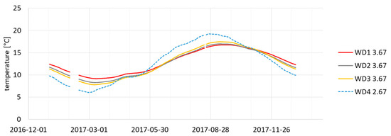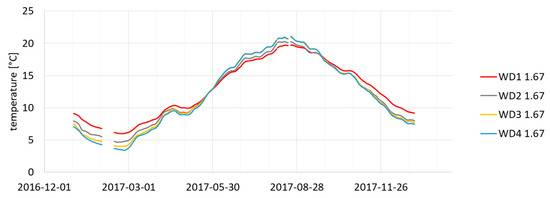 Figure 11. Temperature measured on the axis WD outside the building. The recording of the measurements lasted one year but was interrupted for a few days for technical reasons.