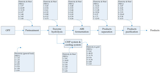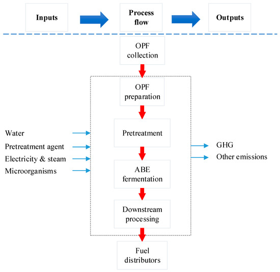 The treated OPF was hydrolyzed while using cellulase enzyme according to [29]. After the hydrolysis process, the hydrolysate mixture was separated from the fibers residue and brought to the closed fermenter, while the fibers residues were used for combined heat and power (CHP) generation. The ABE fermentation was conducted following the works from [30,31]. There were no emissions from the hydrolysis process. However, the ABE fermentation process emitted a substantial amount of carbon dioxide (CO2) and hydrogen (H2).