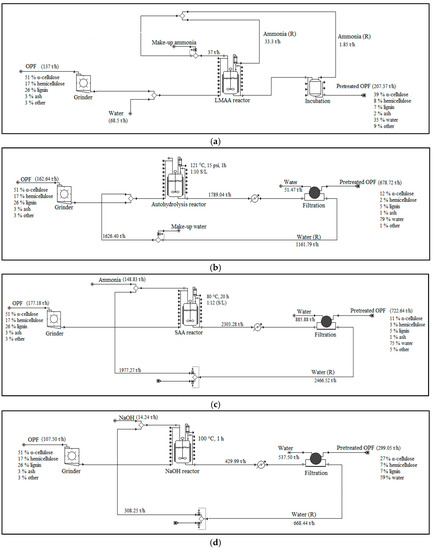 Different pretreatment approaches were primarily selected to serve as a comparison to the performance of LMAA pretreatment, which was the main pretreatment method investigated in this study. The selected pretreatments were from available works on OPF pretreatments, which includes autohydrolysis pretreatment, soaking in aqueous ammonia (SAA) pretreatment, and soaking in sodium hydroxide (NaOH) pretreatment. LMAA was conducted based on works from [19,26]. No emission of ammonia (NH3) to the environment was assumed in LMAA pretreatment. Nevertheless, separate impacts assessment was also conducted on 5% and 9% emissions of NH3 to the environment. The small percentage of NH3 that was retained in the feedstock was not affecting the pH of the system and, hence, the neutralization procedure was not conducted [27].