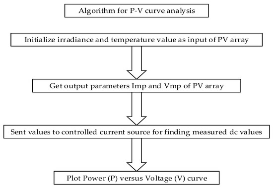 Many interconnected PV cells are packaged in the same PV modules and have the same irradiance value. Therefore, modeling and simulation of PV modules is a key step for the analysis of the P-V curve under normal and fault conditions. PV modules take values of received irradiance and temperature as input parameters to find a solution for current ‘I’ for sending this value to the controlled current source. The P-V curve is plotted after sending measured values of dc voltage and dc current through output parameters of PV modules including Isc, Voc,Vmp, and Imp as given in the algorithm for the P-V curve in Figure 2.