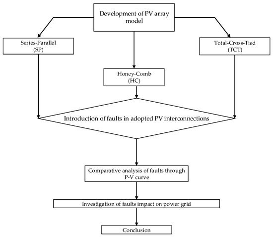 The flow chart of the proposed methodology is given in Figure 3. A Simulink model of a 6 × 6 PV array under electrical faults including module disconnection, short circuit, and module mismatch faults is developed to study the performance of faulted PV array. A special case of multiple faults is also analyzed to study the impact of short-circuit and open-circuit faults under low irradiance conditions on peak power. All faults are thoroughly analyzed on crystalline and thin-film PV technology in all adopted interconnections. The impact of the proposed procedure on performance of a power grid is also analyzed for performance optimization of the PV system.