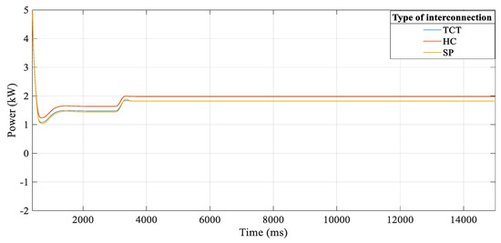 Short circuit fault (F2) reduces tracked MPP from 5.2 kW to 2.27 kW and 2.51 kW in TCT and HC interconnection, respectively, after 3000 ms and continues to track the reduced MPP till the end. SP interconnection performs better than other interconnections and produces tracking power of a 2.62 kW in monocrystalline PV array, as shown in Figure 21. Thin-film PV optimizes the PV performance through increasing tracked MPP from 2.62 kW to 3.01 kW in SP, 2.51 kW to 2.8 kW in HC, and 2.275 kW to 2.75 kW in TCT as shown in Figure 22. TCT interconnection cannot optimize performance in this fault case. Only power loss compensation through TCT interconnection can be achieved under those faults, which results in a sudden decrease of current due to more internal connections in TCT and more current flow in TCT than other interconnections as observed in open-circuit fault (F1) and shading condtions (F3).