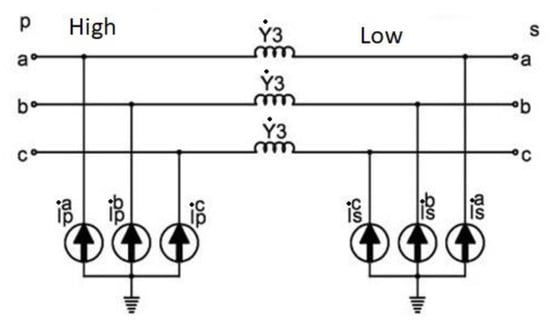 Representation of a distribution transformer with a wye-grounded/wye-grounded connection [28].