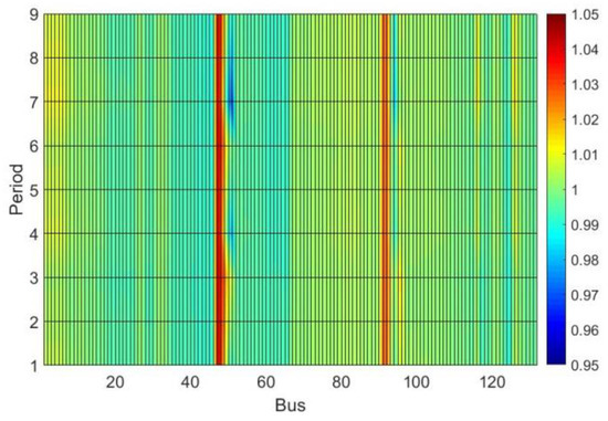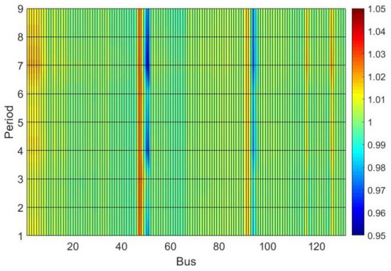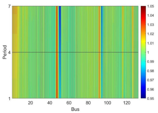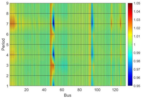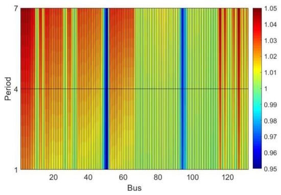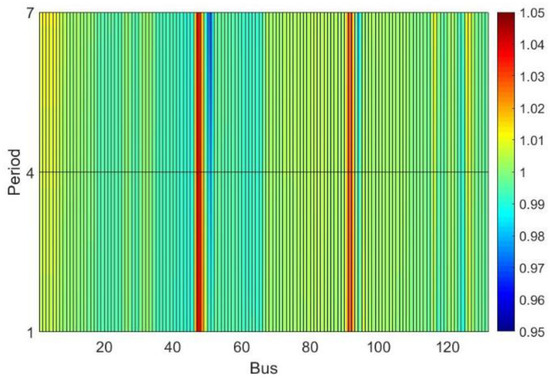 Analyzing Figure 12, it can be observed that the discrete tap adjustments were close to the continuous values. However, all discrete taps were set to values above the continuous. This implies a reduction of the voltage profile at secondary buses of the DTs, as can be seen when comparing Figure 13 and Figure 14. In Figure 14, buses 50 and 51 (DT 1 secondary) and buses 93 and 96 (DT 2 secondary) have colors tending to a darker blue, indicating lower values, especially in period 7 (with heavy load and without PV generation).