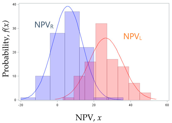 In Scenario 2, the demand rate is uncertain, and this uncertainty affects the production rate. Both the rates are, hence, modelled with stochastic distributions. As a consequence, the savings introduced through the invested capital and the NPV previously obtained are expected values. So, it is not certain that the decision taken will be the best. In this case, it is possible to compare the behavior of two investment options and the respective NPV by evaluating the probability that one NPV is greater than the other, in order to have more precise and detailed results. Specifically, the probability that “SEC levelling” generates higher financial benefits than “SEC reduction,” , is defined in Equation (15).