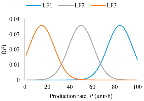 The data available on the demand rates well fit a normal distribution with mean value = 170,000 unit/h and standard deviation = 500, to which corresponds a normal distribution with mean value = 85 unit/h and standard deviation = 11 as a good approximation for the production rate, given the annual operation time. However, the load factor (LF), i.e., production rate probability distributions, highly affects the financial benefits of the two investment options. Thus, the load factor resulting from the real data (LF1) is compared with two additional load factors with the same standard deviation but with different mean values: i.e., 50 unit/h and 15 unit/h for LF2 and LF3, respectively (see Figure 2). It should be noted that scenario 1 represents a particular case of scenario 2 in which the standard deviation is equal to zero.