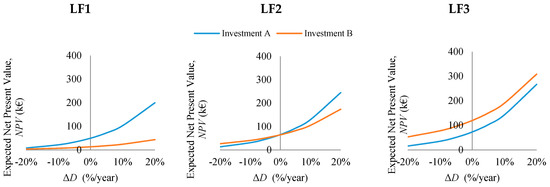 Effects on the NPV of both the investment options—“SEC reduction” (Investment A) and “SEC levelling” (Investment B)—while considering an annual variation of the demand rate.
