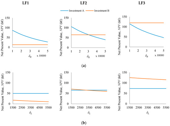 Sensitivity analysis on the expected NPV of the investments in “SEC reduction” (Investment A), and “SEC levelling” (Investment B) for the different load factors with respect to the parameters of the logarithmic investment function: i.e., (a) , and (b) .
