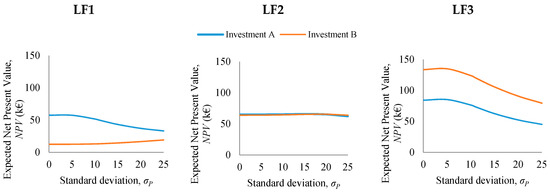 Expected NPV of the investments in “SEC reduction” (Investment A) and “SEC levelling” (Investment B) for different standard deviation values of the normal distributions defining the production rate for the three load factors investigated.