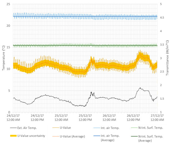 Figure 4 shows indoor and outdoor air temperatures. For indoor temperatures, air temperature in the geometrical center of the dome (position 2 in Figure 2) is represented with the average value. The indoor north surface temperature monitored (average of sensors 12, 17 and 18 in Figure 2) in quasi-steady state conditions [24] with the average value is also plotted. Moreover, the U-value calculated with the average of the indoor temperature and the uncertainty of this calculation according to the sensors accuracy, are also included. The uncertainty for the U-value was determined to be ±4%, applying the standard method for uncertainty propagation [29].